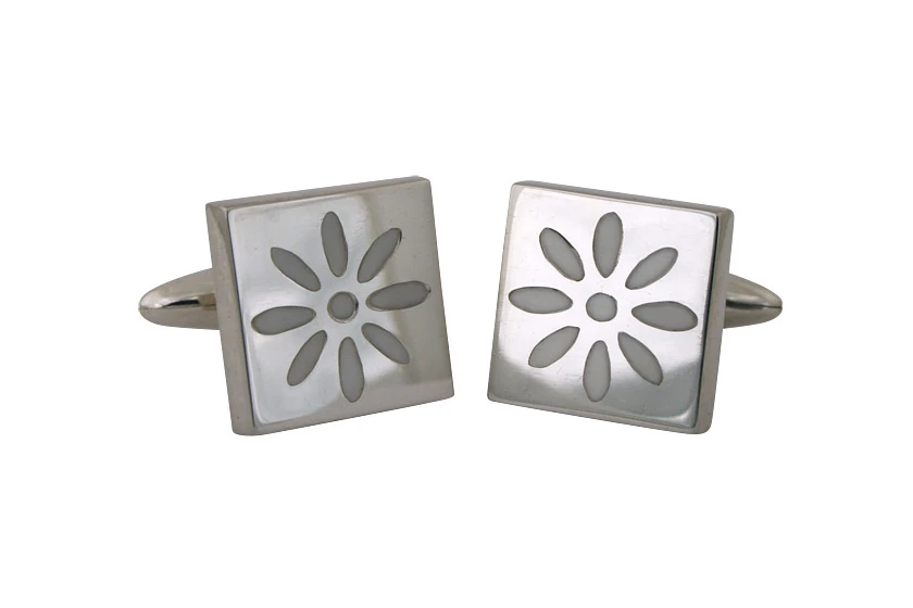 Frentes cuadrados con una flor estilizada: centro redondo y ocho pétalos alargados dispuestos en corona. Estos gemelos flor trazan un ritmo radial nítido que aporta orden y frescura a la bocamanga. El contorno depurado se integra con camisas de corte actual, listo para cócteles, actos destacados y anuncios personales que piden un acento distintivo.